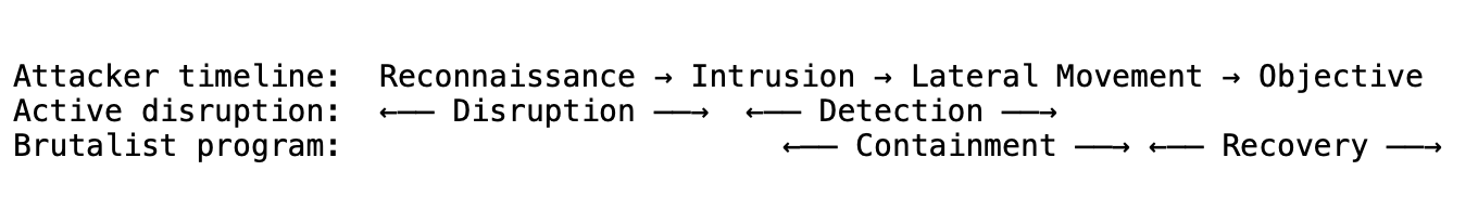 Active disruption and the security brutalist architecture answer different questions across the attack timeline: